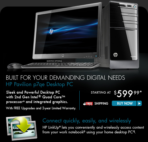 * Offer is good while supplies last. Offer is also subject to change or cancellation at any time. See product page for details. Prices shown may include applicable instant savings. Restrictions apply to sale items and are subject to change wit hout notice. Offer on HP Pavilion dv7t Notebook PC and HP LaserJet Pro M1212nf MFP Printer valid through 10/22/2011. Offer on HP Pavilion p7qe Desktop PC valid through 10/23/2011.