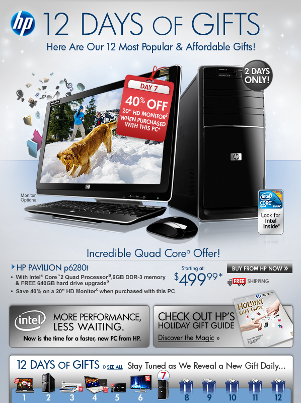 * Total savings achieved by combining EPP savings with instant savings. Offer is good while supplies last. Offer is also subject to change or cancellation at any time. See product page for details. Prices shown may include applicable instant savings. Restrictions apply to sale items and are subject to change without notice. Offer on HP Pavilion p6280t Desktop PC valid through 12/10/2009.