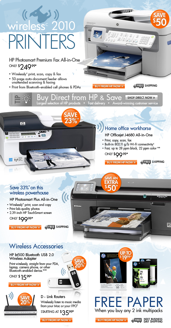 * Offer is good while supplies last. Offer is also subject to change or cancellation at any time. See product page for details. Prices shown may include applicable instant savings. Restrictions apply to sale items and are subject to change without notice. Offer on HP Photosmart Premium Fax All-in-One Printer, Scanner, Fax, Copier, HP Officejet J4680 All-in-One Printer, Fax, Scanner, Copier, HP Photosmart Plus All-in-One Printer, HP bt500 Bluetooth USB 2.0 Wireless Adapter and HP 74/75 Ink Cartridge Combo Pack valid through 2/6/2010. Free HP paper applies to purchase of two ink multipacks priced at $19.99 or greater. Limit two (2) gifts per customer. See product page for details.