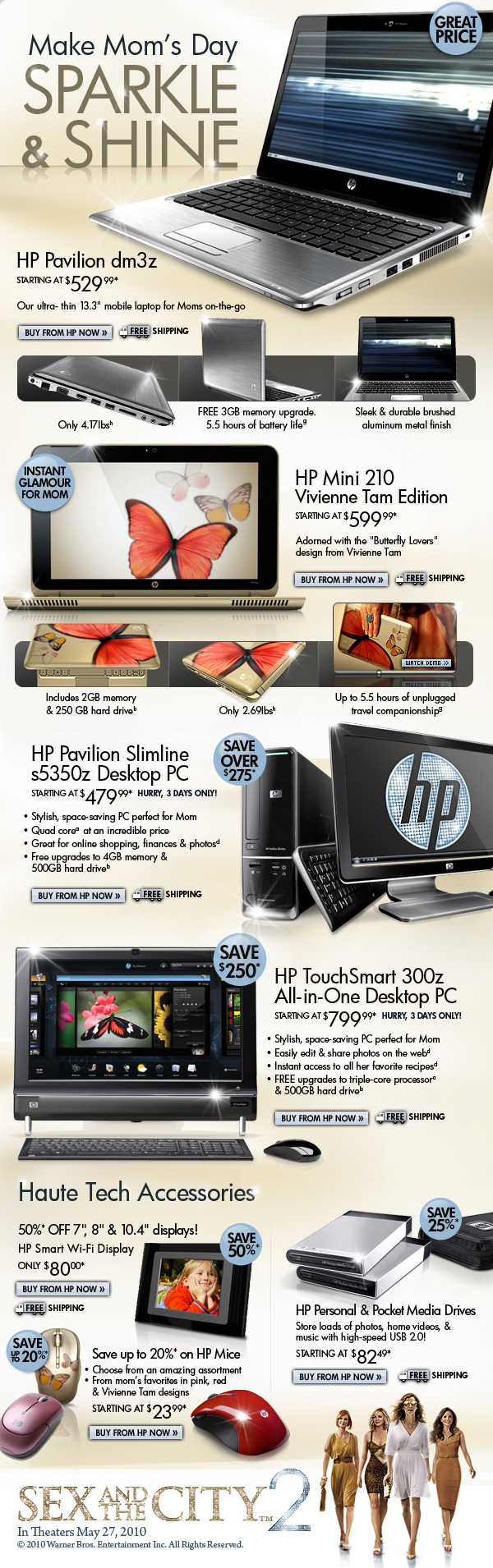 * Offer is good while supplies last. Offer is also subject to change or cancellation at any time. See product page for details. Prices shown may include applicable instant savings. Restrictions apply to sale items and are subject to change without notice. Offer on HP Mini 210 Vivienne Tam Edition Notebook PC, HP Pavilion dm3z Notebook PC, HP Pavilion Slimline s5350z Desktop PC, HP TouchSmart 300z All-in-One Desktop valid through 4/27/2010. HP Digital Picture Frames, HP Mice & HP Personal & Pocket Media Drives valid through 5/1/2010.