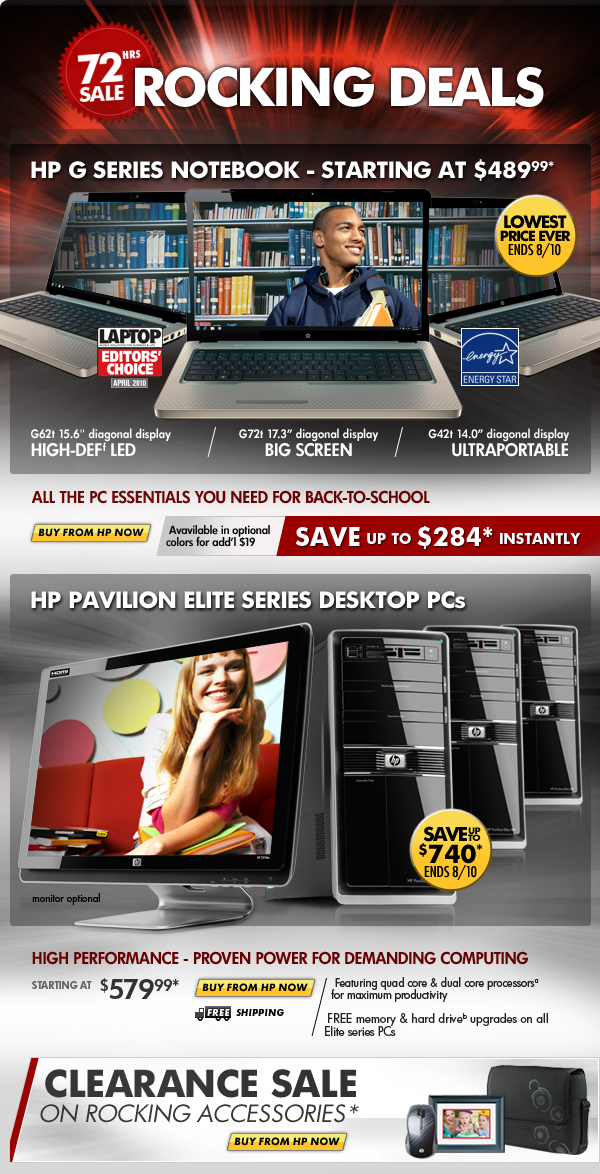 * Offer is good while supplies last. Offer is also subject to change or cancellation at any time. See product page for details. Prices shown may include applicable instant savings. Restrictions apply to sale items and are subject to change without notice. Offer on HP G Series Notebook PC valid through 8/10/2010. Offer on HP Pavilion Elite Series Desktop PC valid through 8/10/2010.