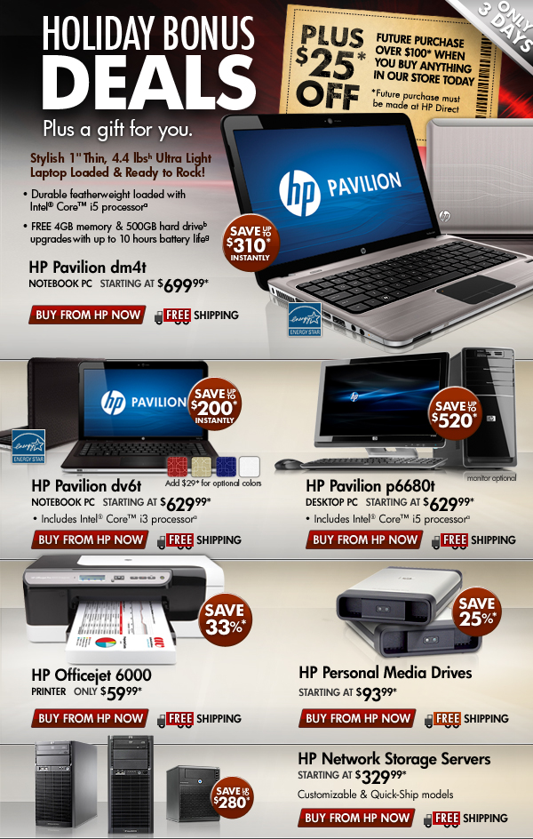 * Offer is good while supplies last. Offer is also subject to change or cancellation at any time. See product page for details. Prices shown may include applicable instant savings. Restrictions apply to sale items and are subject to change without notice. Offer on HP Pavilion dm4t Notebook PC, HP Pavilion dv6t Notebook PC & HP Pavilion p6680t Desktop PC valid through 11/9/2010.Offer on HP Officejet 6000 Printer, HP Personal Media Drives & HP Network Storage Servers valid through 11/13/2010.