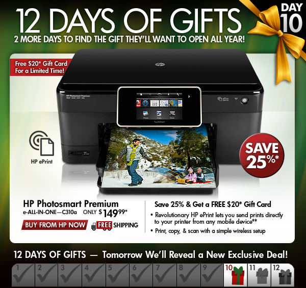 * Offer is good while supplies last. Offer is also subject to change or cancellation at any time. See product page for details. Prices shown may include applicable instant savings. Restrictions apply to sale items and are subject to change without notice. Offer on HP Photosmart Premium e-All-in-One Printer - C310a valid through 12/11/2010.