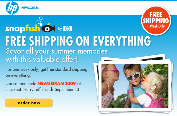 U.S. customers only. Coupon may only be used once per account, but can be used for numerous products within that one use. Must use coupon code NEWSGRAM2009 at checkout to receive free standard shipping on all products, except the following: free prints, gift certificates, high-resolution downloads, and pre-paid prints. Offer does not apply to any upgraded shipping options. Applicable taxes still apply. Offer may not be used in conjunction with any other offer or promotion. Offer expires 9/13/2009.