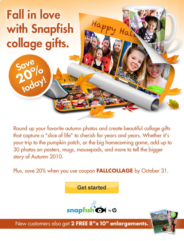 * U.S. customers only. Must use coupon code FALLCOLLAGE to receive 20 % off your order from the collage gifts store. Coupon may be used twice. New users will receive an additional 2 free 8" x 10" enlargements automatically upon registration and first photo upload. Offers apply to mail-order purchases only, and cannot be used for in-store pick-up. Taxes, shipping and handling charges apply. Offers may not be used in conjunction with any other offer. Offer expires 10/31/2010.
