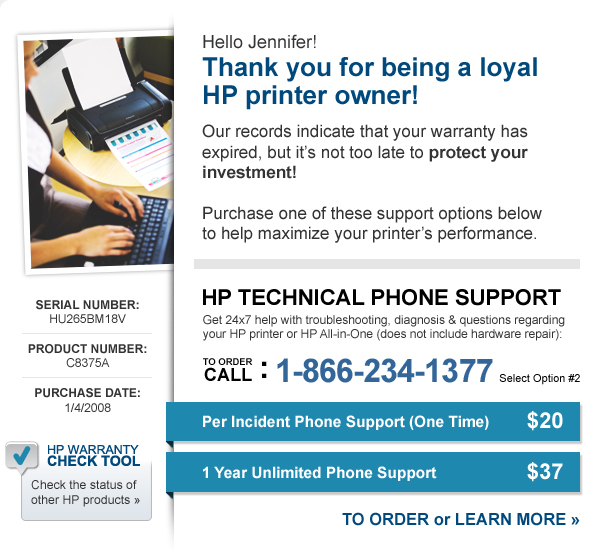 * Offer valid on select HP Consumer Printers (HP Deskjet, HP Officejet, HP Photosmart printers and select HP LaserJet printers) Contact HP at 1.866.234.1377 (select option #2) to verify available support options for your out-of-warranty HP Printer.