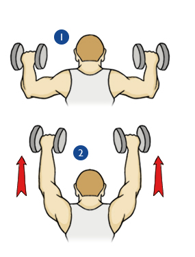 Straighten your arms, pushing the weights above your head, palms facing out.
