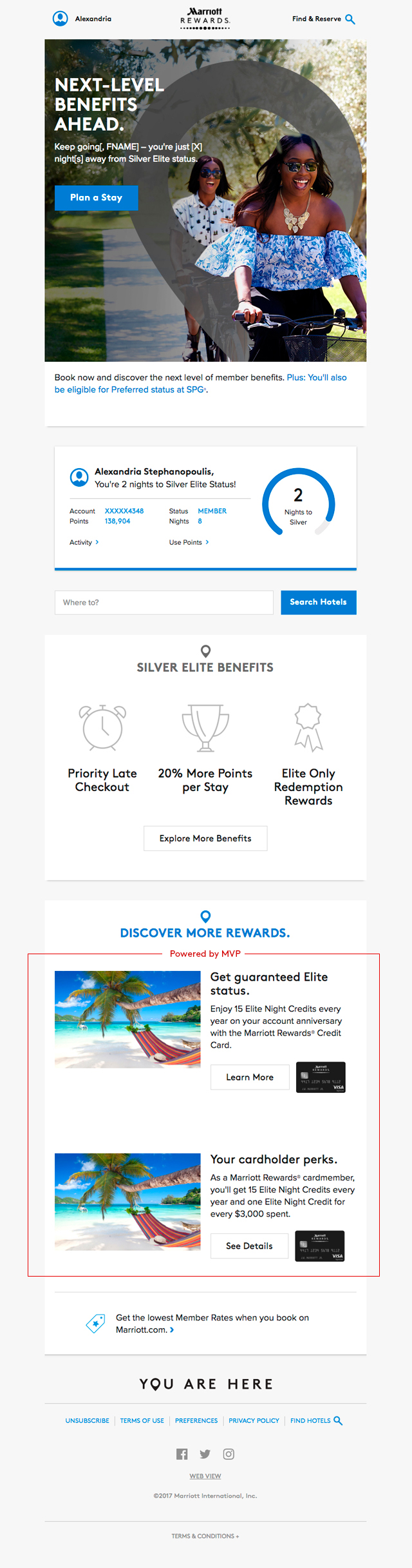 | Sent to members who are close to achieving the next Elite level with an incentive to book their next stay. Email targets Basic members who are 2-3 nights away from Silver status & Silver and Gold members are targeted 10-15 nights away from Gold and Platinum respectively. |